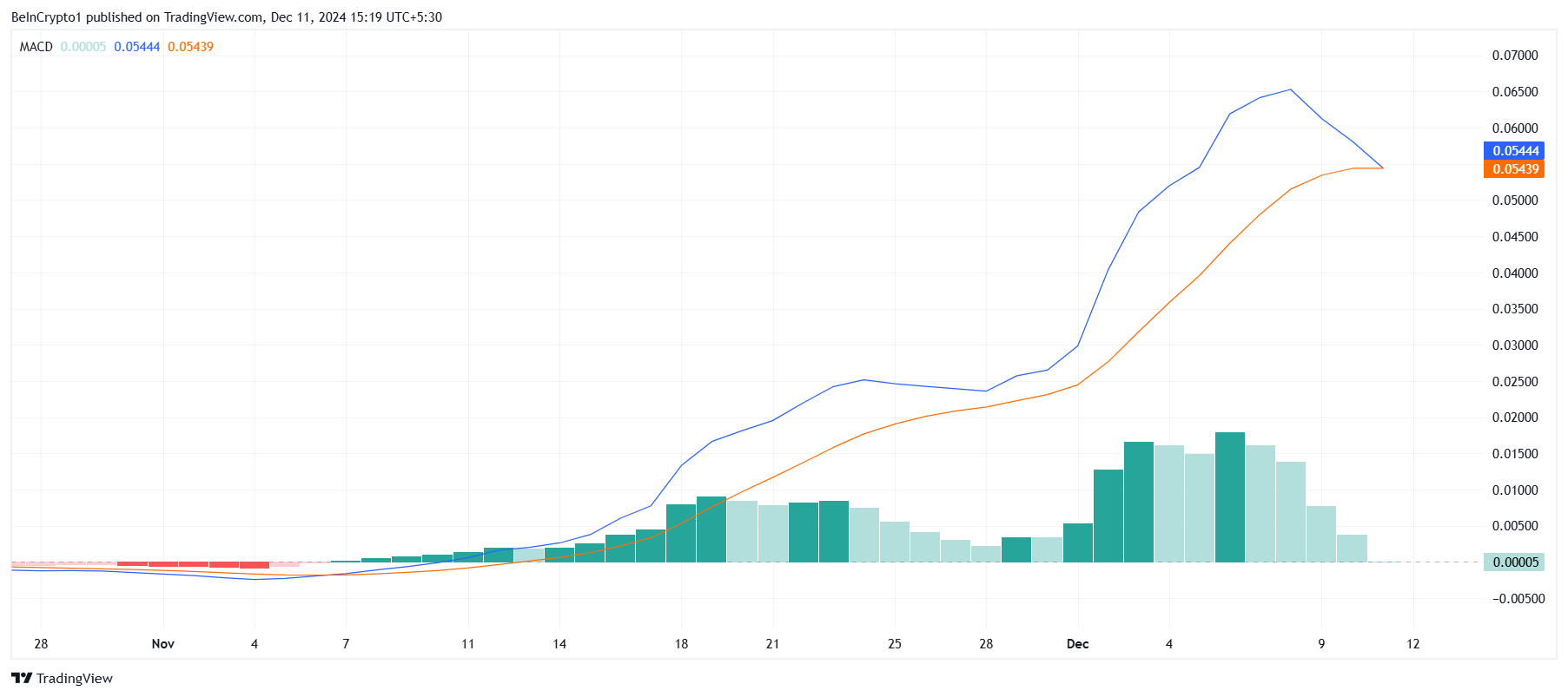 تظهر الزخم الكلي لـHBAR أيضًا علامات ضعف. تشير المؤشرات الفنية، مثل تقارب وتباعد المتوسط المتحرك (MACD)، إلى أن العملة المشفرة على وشك تقاطع هبوطي. قد يشير هذا التقاطع إلى نهاية الزخم الصعودي الأخير لـHBAR الذي استمر خلال الشهر الماضي.