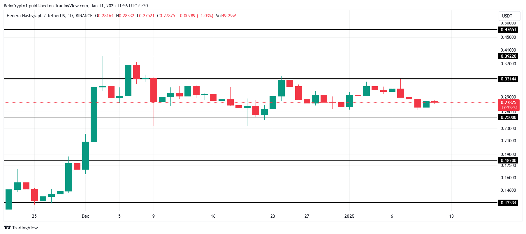 ومع ذلك، قد يوفر تغيير في معنويات السوق سيناريو أكثر تفاؤلاً. إذا تحولت اتجاهات سوق العملات الرقمية الأوسع إلى صعودية، قد يخترق HBAR مستوى المقاومة $0,33. في مثل هذه الحالة، يمكن للعملة البديلة أن تستهدف $0,39، مما يمثل ارتفاعًا بنسبة 40%. سيدفع هذا HBAR إلى أعلى مستوى في 2024 ويفند النظرة الهبوطية بشكل فعال.