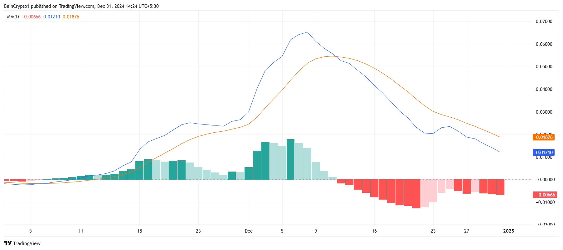 ترسم المؤشرات الفنية صورة مقلقة لـ الزخم الكلي لـ HBAR. يظهر مؤشر تقارب وتباعد المتوسط المتحرك (MACD) أن الزخم الهبوطي يزداد قوة بعد توقف قصير، مما يشير إلى زيادة ضغط البيع. يشير هذا التحول إلى أن الاتجاه الهبوطي قد يتسارع، مما يحد من قدرة HBAR على الخروج من نطاقها الحالي.