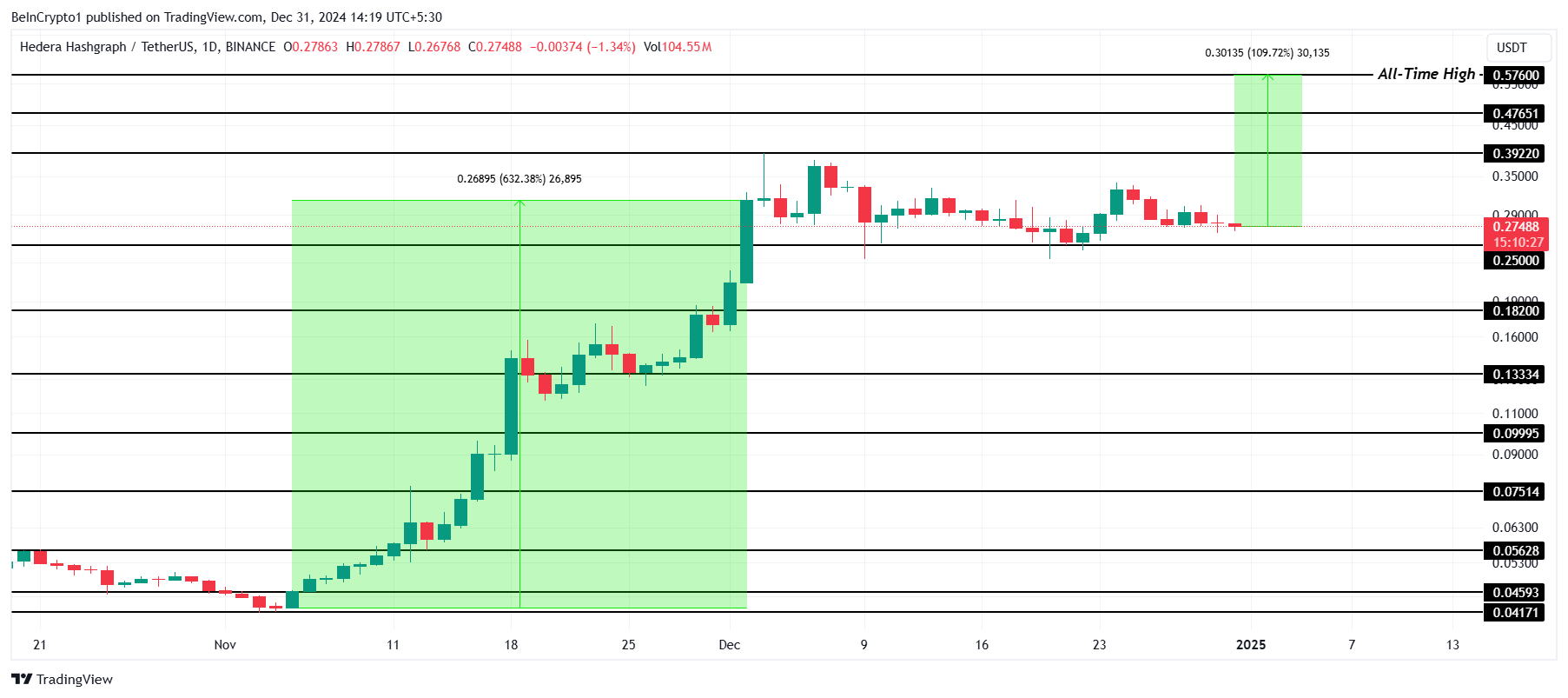 بينما من غير المحتمل حدوث ارتفاع بهذا الحجم في يناير 2025، حتى الزخم المعتدل يمكن أن يدفع HBAR للأعلى. ومع ذلك، فإن الفشل في اختراق $0,39 يمكن أن يمدد فترة التماسك أو يؤدي إلى انخفاض دون $0,25. في هذا السيناريو، قد ينخفض HBAR إلى $0,18.
