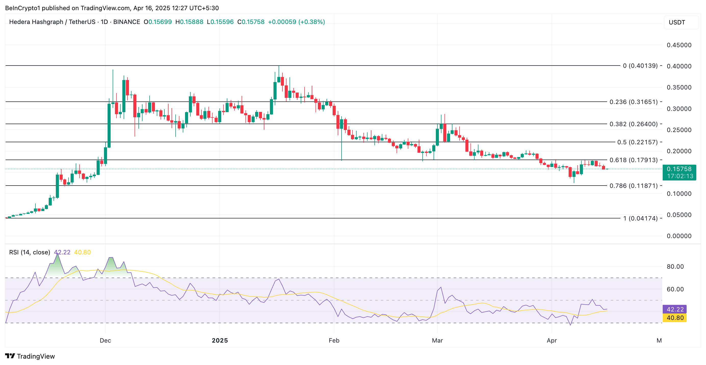 مؤشر القوة النسبية لـ HBAR يستمر في الانخفاض، مما يؤكد ضعف الطلب على العملة البديلة واستمرار الضغط البيعي. في وقت كتابة هذا التقرير، مؤشر الزخم عند 42,22.