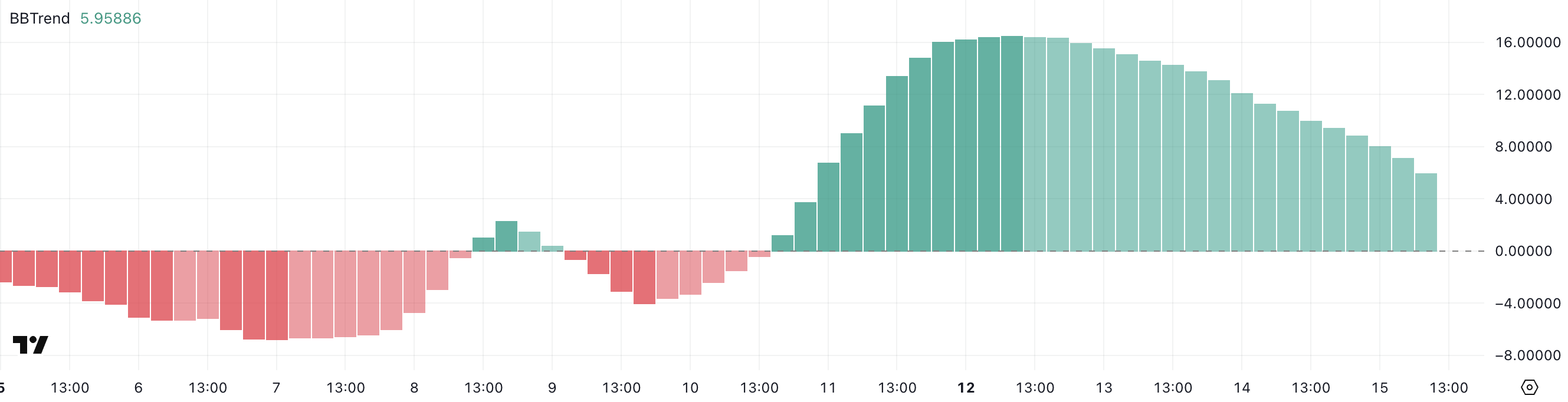 غالبًا ما يسبق انخفاض BBTrend فترات من التوحيد أو الانعكاس، خاصةً عندما يقترن بعلامات أخرى على تبريد التقلبات أو الحجم.