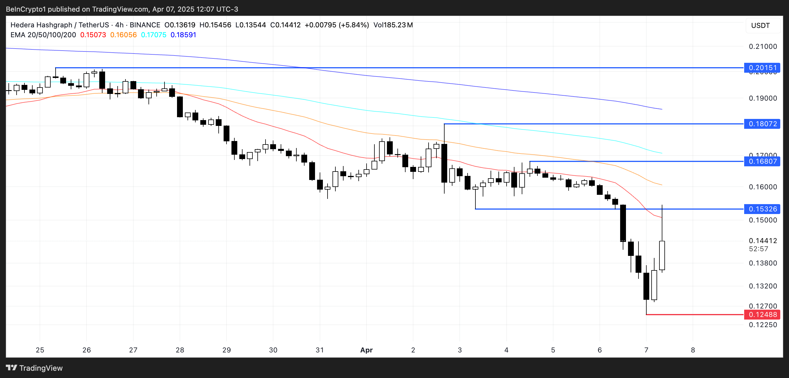 تستمر خطوط EMA (المتوسط المتحرك الأسي) لـHedera في الإشارة إلى اتجاه هبوطي، حيث تقع المتوسطات قصيرة الأجل تحت المتوسطات طويلة الأجل - وهو مؤشر كلاسيكي على الزخم الهبوطي.