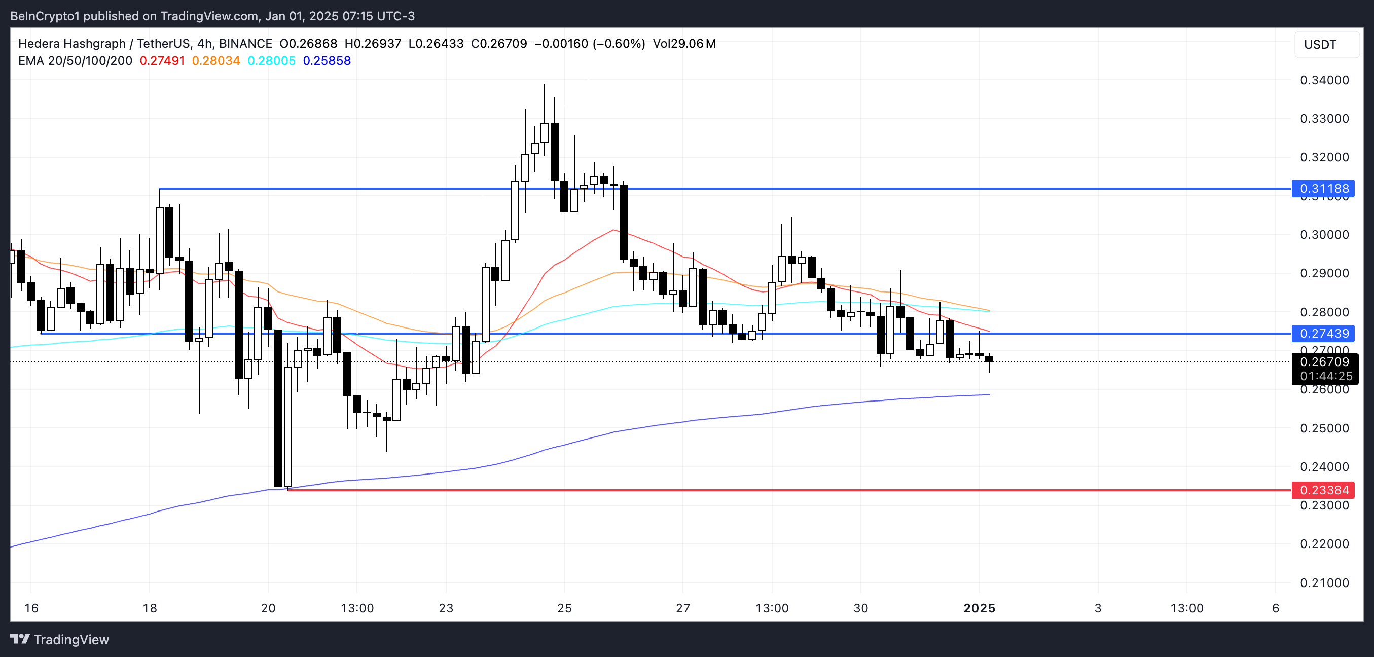 إذا انعكس الاتجاه، قد يختبر سعر عملة HBAR أولاً المقاومة عند $0,274. اختراق هذا المستوى سيشير إلى زيادة الزخم الصعودي، مما قد يدفع السعر نحو المقاومة التالية عند $0,311.