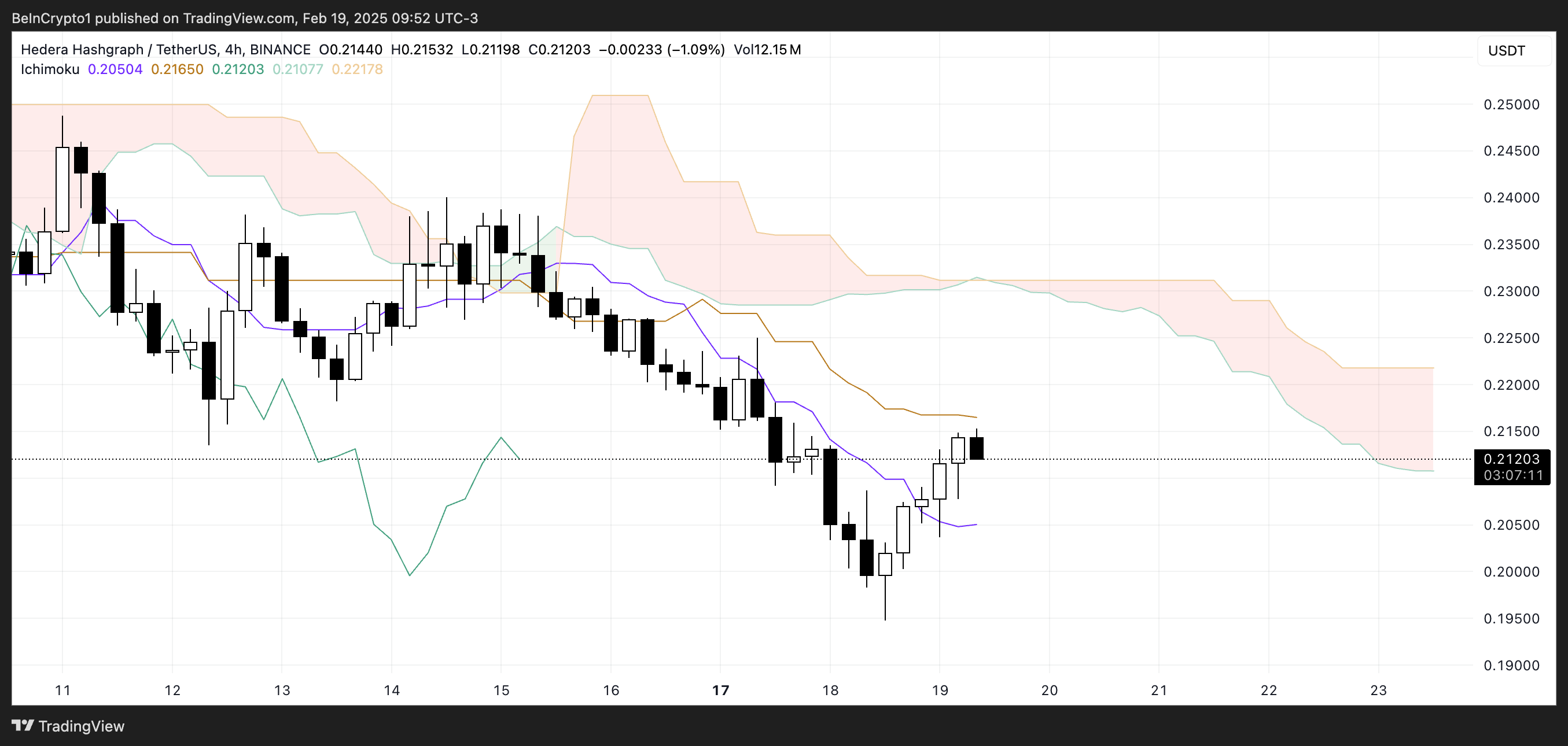 لتحقيق انعكاس اتجاه ذو معنى، يجب أن يكسر السعر فوق الخط البرتقالي كيجون-سن وفي النهاية يتحرك داخل السحابة، مما يقلل من تأثير الزخم الهبوطي. إذا تمكن HBAR من تجاوز السحابة وتحويلها إلى خضراء، فسوف يشير ذلك إلى تحول محتمل نحو اتجاه صعودي.