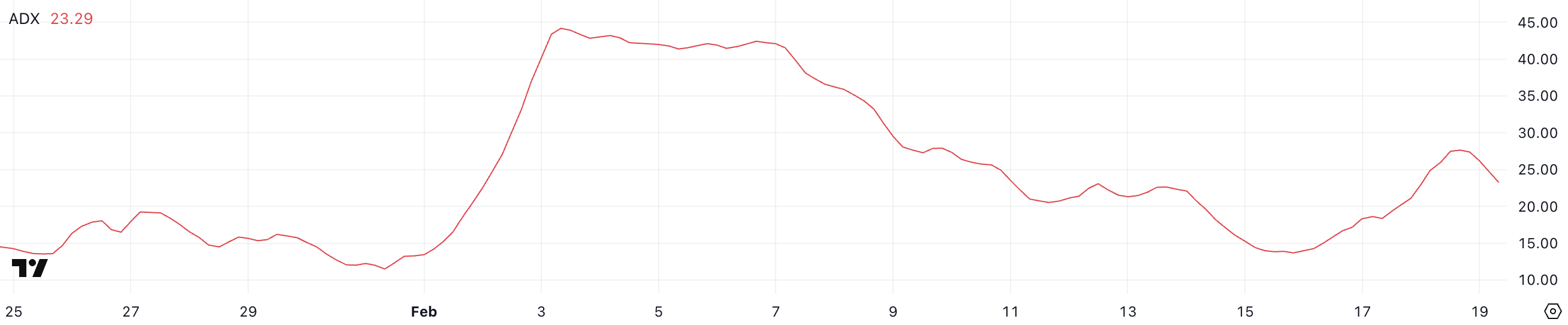 يقيس ADX القوة العامة للاتجاه، وليس اتجاهه. بينما يحاول هيديرا التحول من اتجاه هبوطي إلى اتجاه صعودي، يشير الانخفاض الحالي في ADX إلى أن هذا التحول لم يثبت بعد بشكل قاطع.