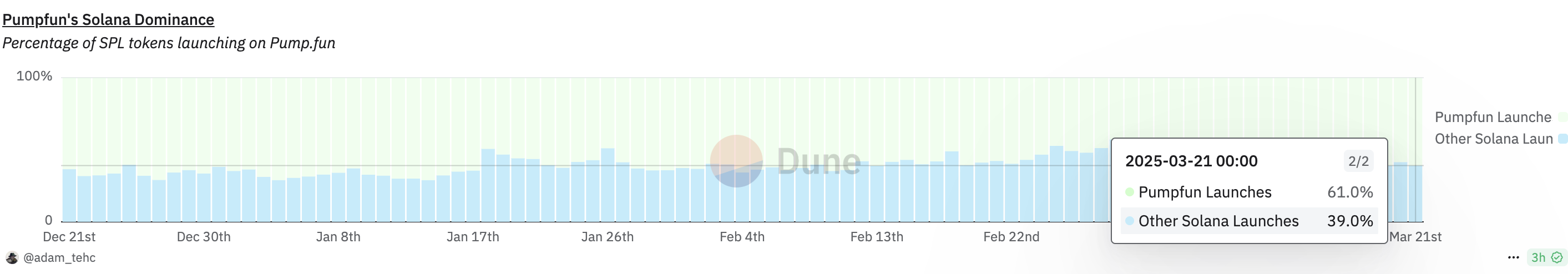 أدت التطورات إلى انفجار آلاف من عملات الميم الجديدة كل أسبوع. تُظهر بيانات Dune أن أكثر من 8٬7 مليون توكن تم إنشاؤها على Pump.fun. منذ إطلاقها، بلغ متوسط Pump.fun أكثر من 621٬000 توكن جديد شهريًا. شكلت التوكنات من Pump.fun نسبة 61% من التوكنات التي تم إطلاقها على سولانا.