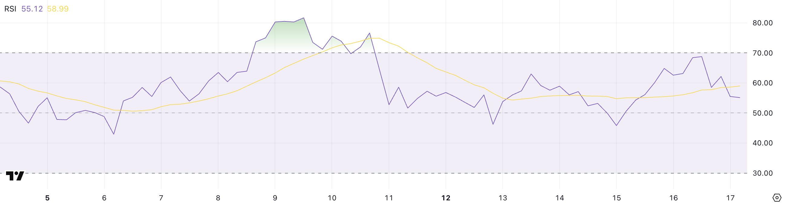 انخفض RSI لـ Hyperliquid إلى 55,15، من 68,76 أمس، بعد أن ارتفع من 45,82 قبل يومين فقط. مؤشر القوة النسبية (RSI) هو مذبذب زخم يتتبع سرعة وحجم تحركات الأسعار على مقياس من 0 إلى 100.