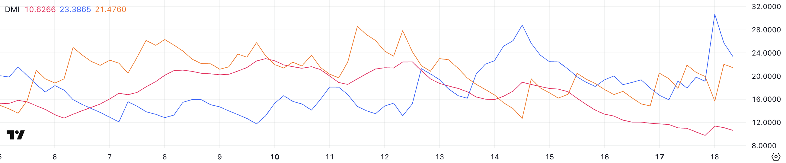 في الوقت نفسه، يبقى +DI (23,3) أعلى قليلاً من -DI (21,4)، مما يشير إلى أن الضغط الصعودي لا يزال موجودًا ولكنه ليس مهيمنًا.