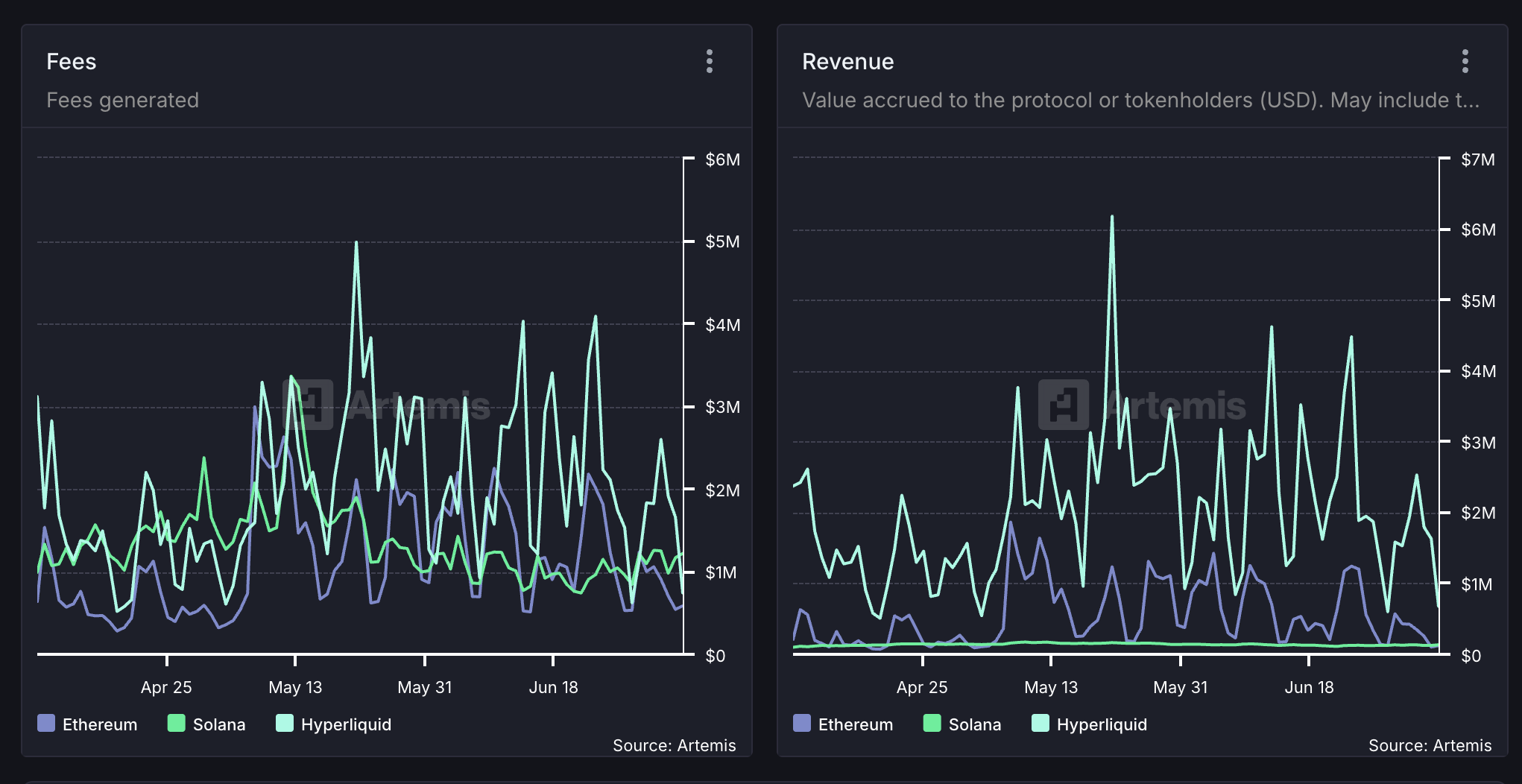 وفقًا لبيانات السلسلة، تفوقت هايبرليكويد باستمرار على الشبكات الراسخة سولانا (SOL) و إيثريوم (ETH) في الإيرادات اليومية على مدار الأشهر الثلاثة الماضية.