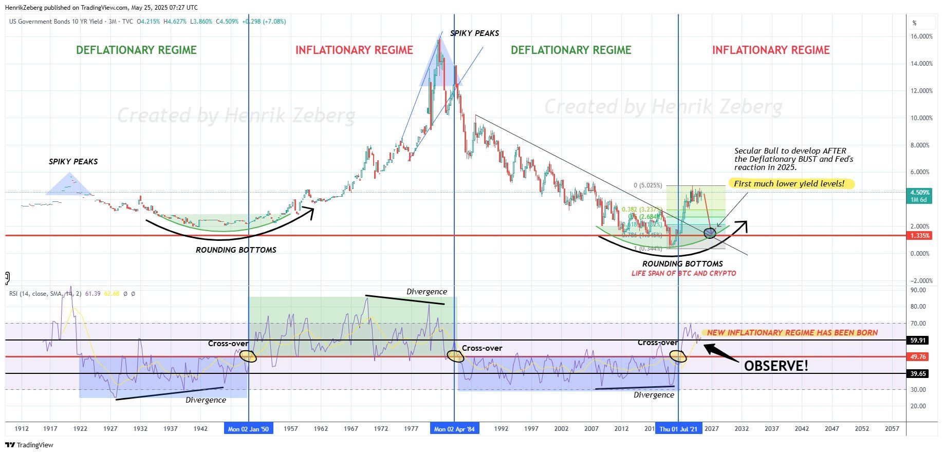 هنريك زيبرغ، رئيس الاقتصاد الكلي في سويس بلوك، شارك مؤخرًا نظرة تمتد لقرن من الزمن على عائد السندات الحكومية الأمريكية لمدة 10 سنوات. يصنف مخططه المراحل الاقتصادية التاريخية إلى أنظمة تضخمية وانكماشية.