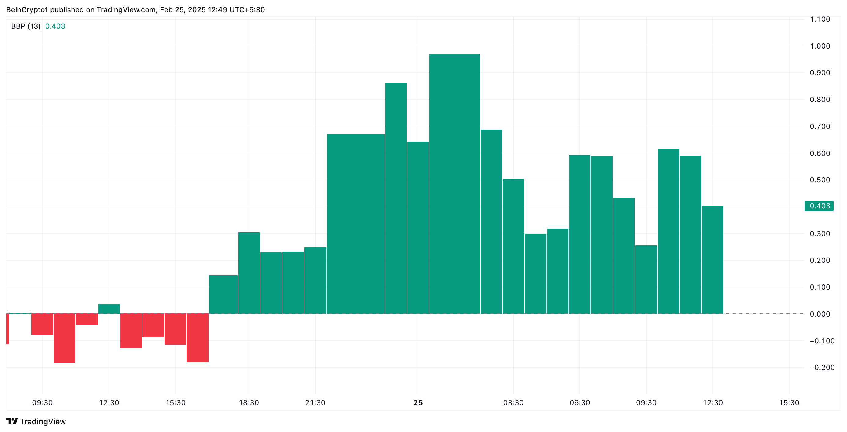 عندما تكون قيمته إيجابية مثل هذه، يكون الثيران في السيطرة، حيث يتم تداول سعر الأصل فوق متوسطه المتحرك الأسي (EMA)، مما يشير إلى ضغط شراء قوي.