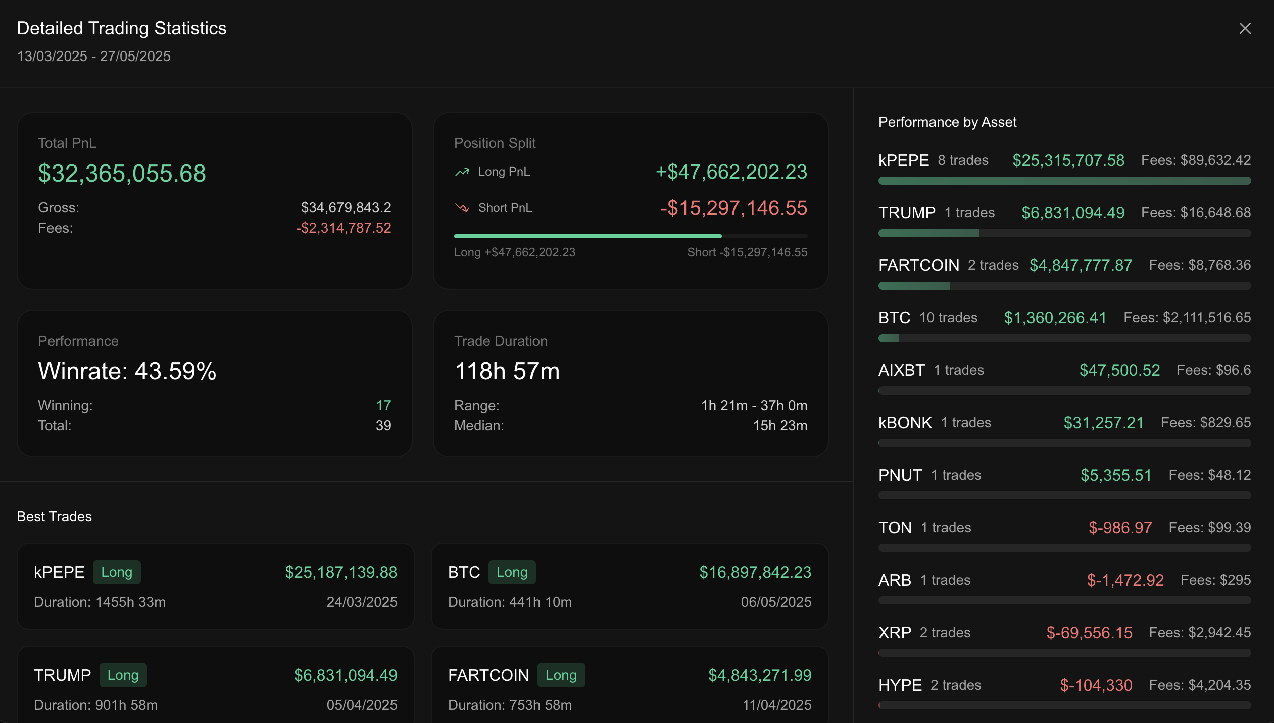 وفقًا لبيانات Hyperdash، نفذ المتداول ما مجموعه 39 صفقة، منها 17 صفقة حققت أرباحًا. وهذا يعادل معدل نجاح بنسبة 43,59%. بلغت أرباحه ذروتها عند 87 مليون دولار في 23 مايو 2025.
