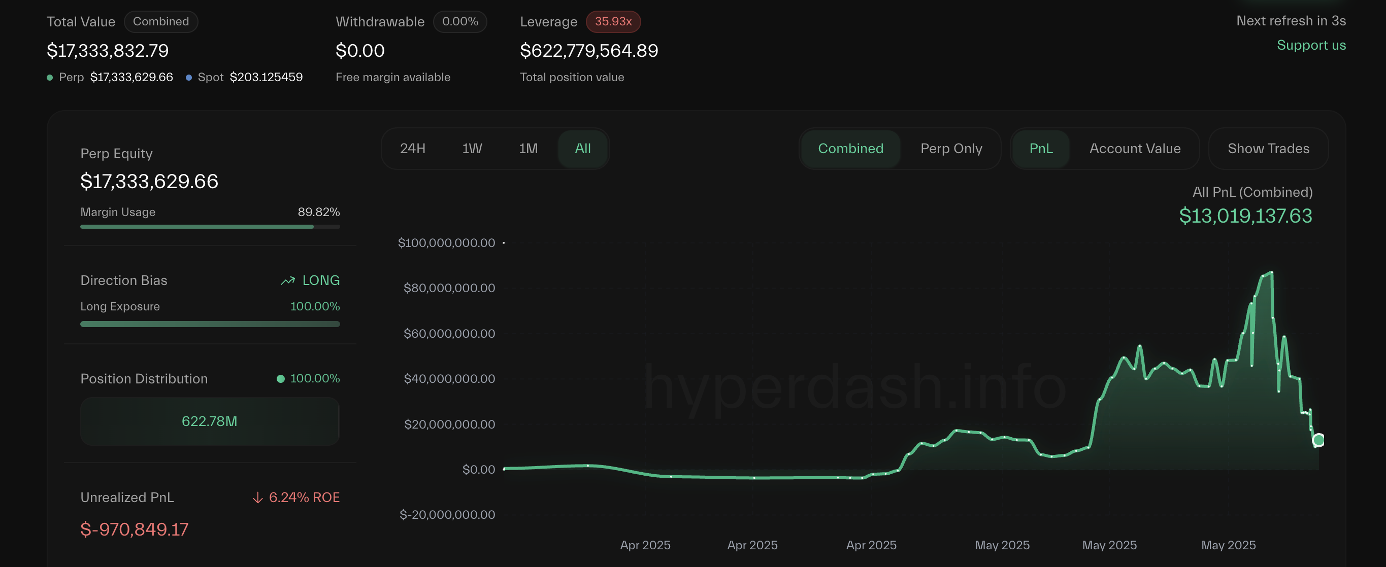 بعد نجاحه الأولي مع عملات الميم، حول التاجر تركيزه إلى التداول بالرافعة المالية وانضم إلى Hyperliquid. بدأ التداول بنشاط على المنصة في مارس.