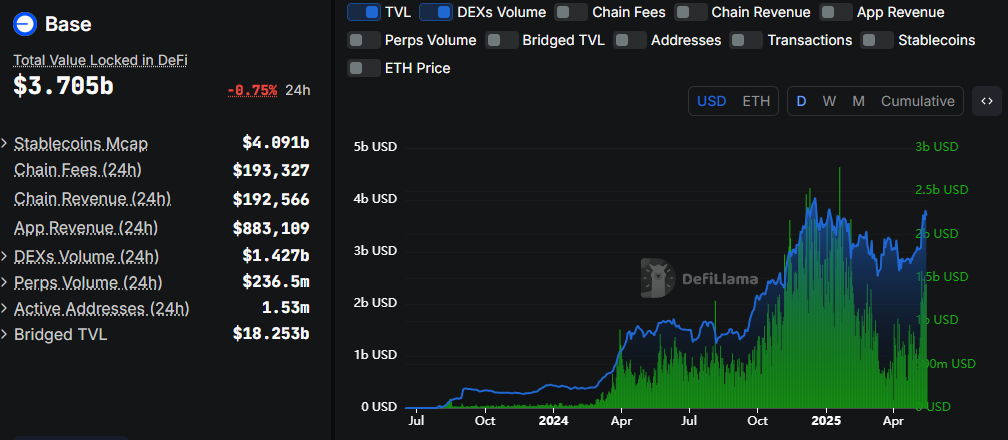 بلغت قيمة Base TVL (إجمالي القيمة المقفلة) ٣٬٧٠٥ مليار دولار (باللون الأزرق) اعتبارًا من كتابة هذا التقرير، بزيادة ٢١٪ عن ٣٬٠٦٣ مليار دولار في ٧ مايو. وبالمثل، ارتفع حجم DEX (باللون الأخضر) أيضًا، مما يشير إلى زيادة ثقة المستخدمين، السيولة، واعتماد DeFi.
