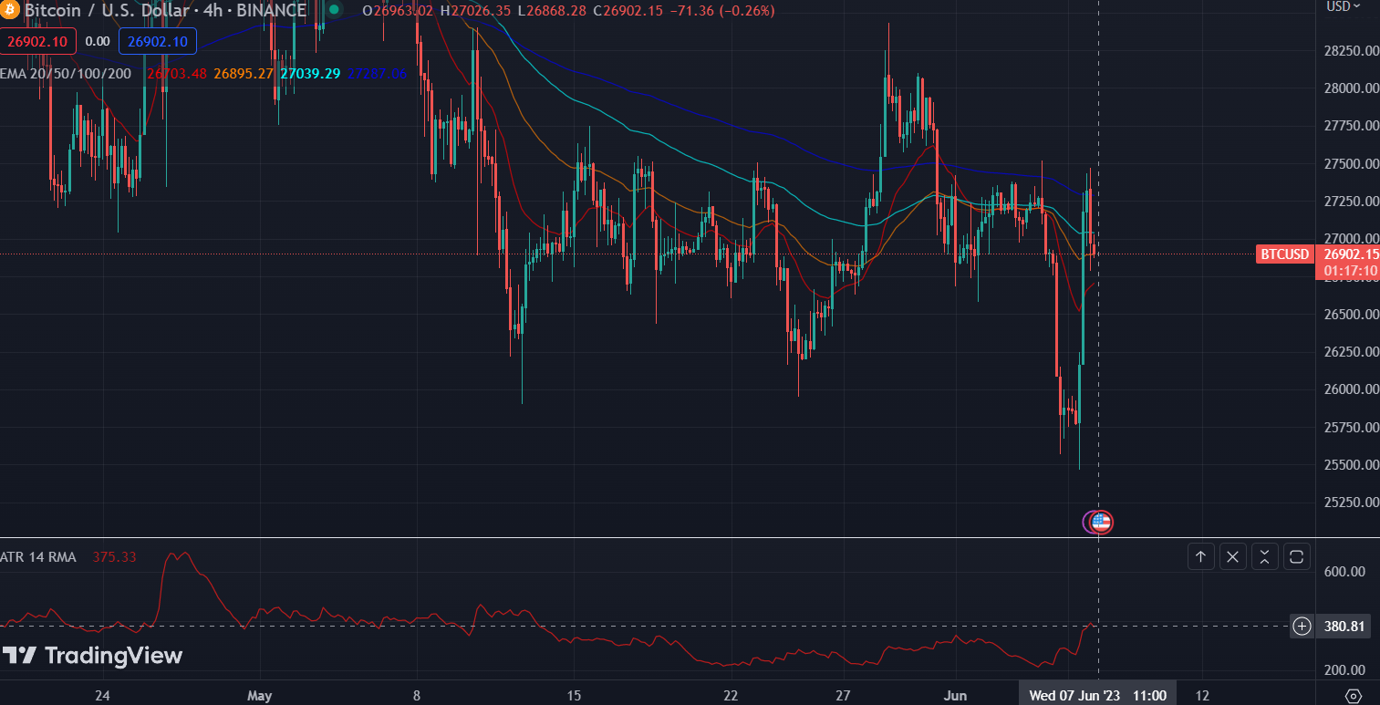 بالرسم البياني بالأعلى يمكنك أن تتعرف على حجم الذبذبة المتوقع لبيتكوين من خلال مؤشر ATR بالأحمر أسفل الصورة. المؤشر يشير إلى 380. فماذا يعني هذا الرقم؟