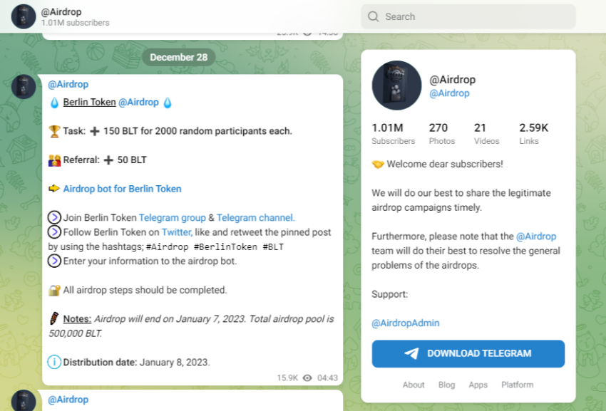 ويمكن أن تكون هذه الطريقة جيدة للمستثمرين وبناءً قيمة دون دفع ثمن وبالتالي بناء مجتمع من الداعمين، وتضم هذه المجموعة أكثر من مليون مشترك على تليجرام حيث تزويد المستخدمين بمشاريع جديدة.