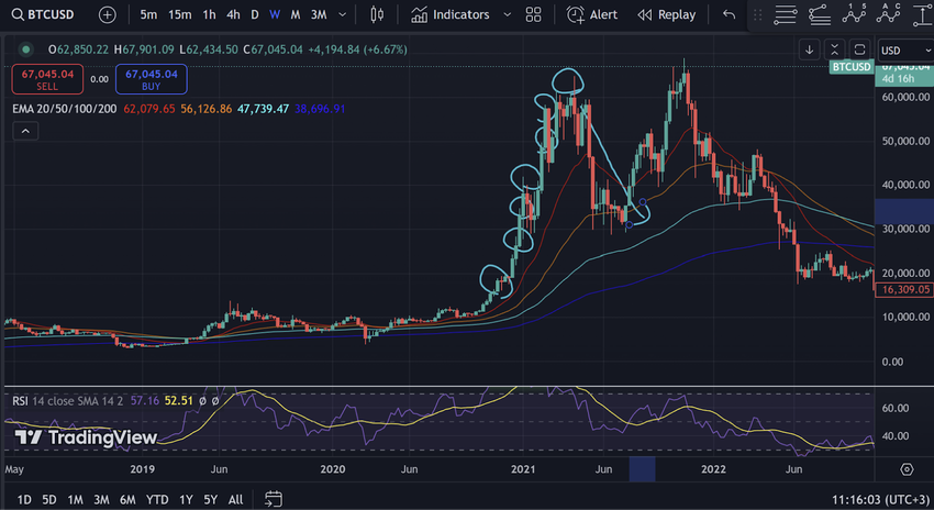 تذكر أن في السوق الصاعدة في كل مرة يصعد السوق ويشكل قمة، يتذبذب في قناة من أجل تشكيل نقطة دعم. بعد هذا يعاود الصعود لتشكيل قمة جديدة وتظل هذه العملية تتكر حتى يفشل السوق في تشكيل قمة جديدة. لاحظ بالرسم البياني بالأعلى كيف أن في عام 2020 و2021 ظل السعر يشكل قمة تلو الأخرى لعدة أشهر متتالية.