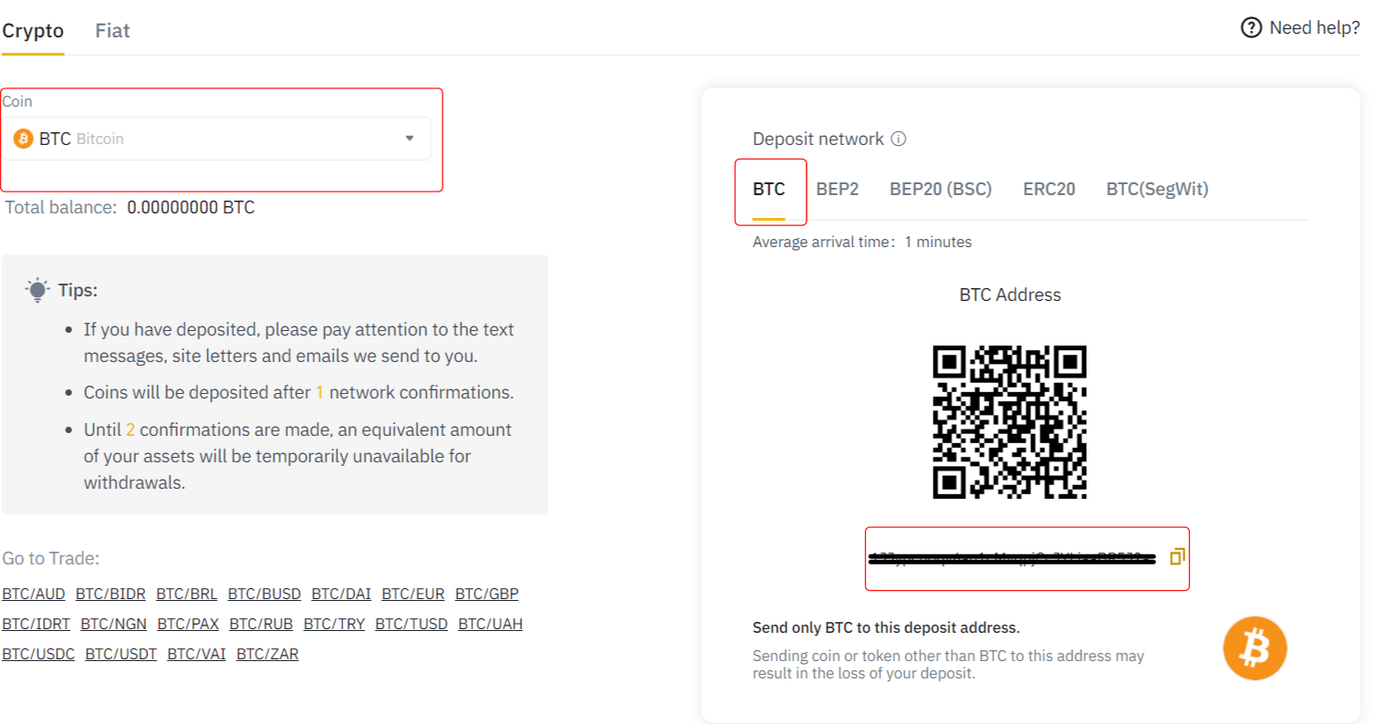 - إيداع عملة البتكوين على بينانس