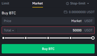 صفقات تُنفذ بأسرع وقت بسعر السوق، ويشتري المستخدم العملة بأمر السوق ليتم تنفيذ الأمر بسعر البتكوين عند تنفيذه.