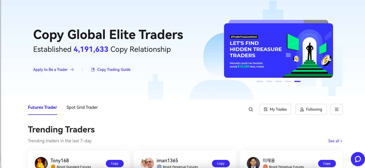 تقدم BingX أكثر من 350 أصل تشفير ولديها أكثر من 5 ملايين مستخدم حول العالم. وهي أيضًا واحدة من منصات المشتقات القليلة التي تقدم نظام نسخ للتداول. باستخدامه، يمكن لمستثمري التشفير الجدد متابعة ونسخ استراتيجيات كبار المتداولين بسهولة، مقابل عمولة 8٪.