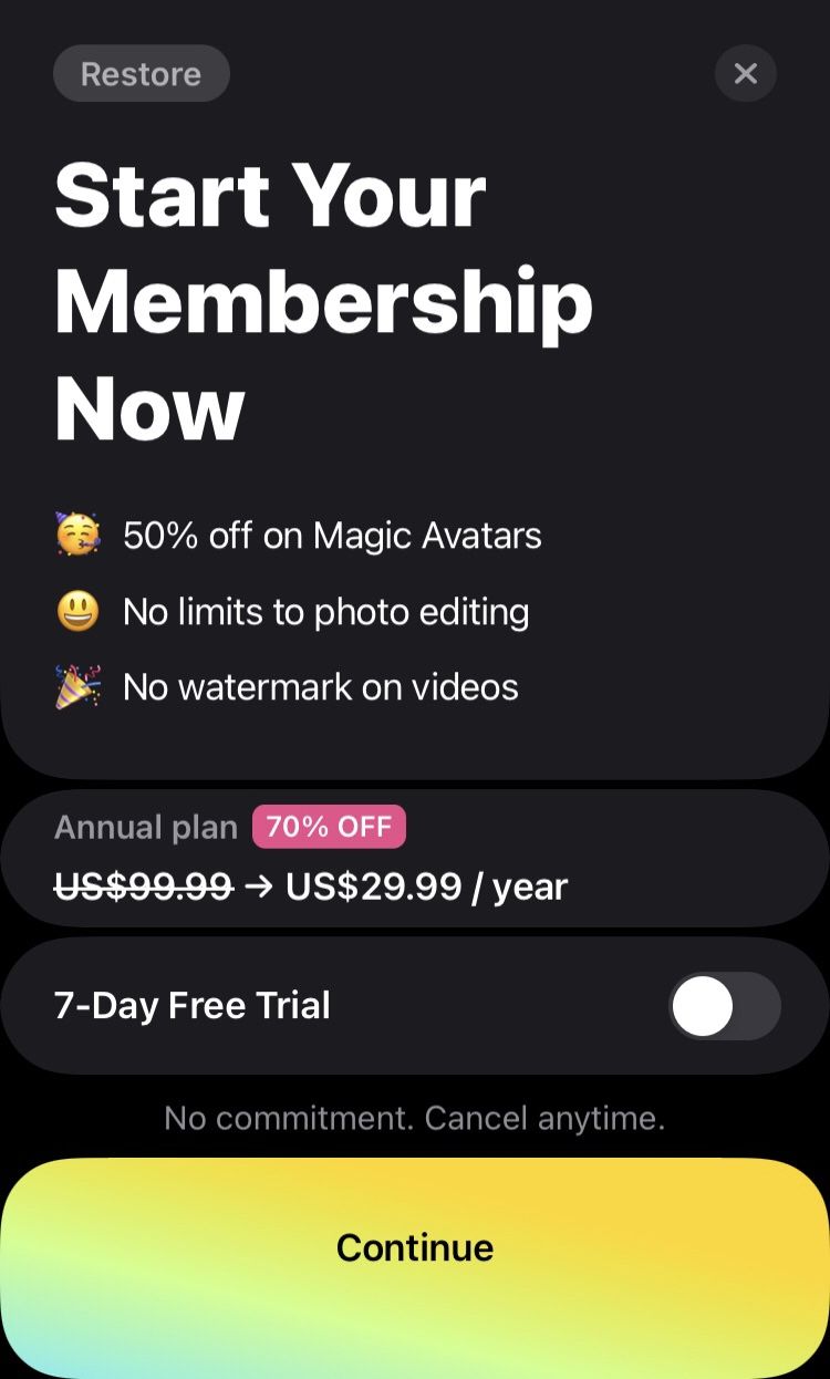 في وقت كتابة هذا المقال كان لدى تطبيق Lensa خطة سنوية بخصم 70% فبدلاً من 99.99 دولار صارت الرقم 29.99 دولار سنوي، وكانت الشركة القائمة على التطبيق تصدر إصداراً تجريباً مجانياً لمدة أسبوع ليكتشف المستخدمين التطبيق قبل إجراء الاشتراك المدفوع.