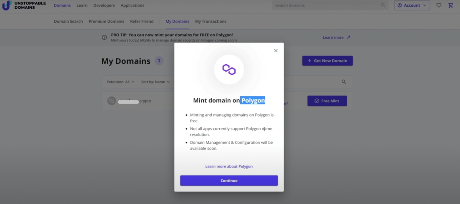 بعد الشراء تأتي خطوة البث على شبكة بلوك تشين، اذهب إلى My Domains ثم اختر Free mint وإذا كنت تمتلك نطاق ينتهي ب .crypto يمكنك سكه على شبكة بوليجون التي تمثل حل الطبقة الثانية لإيثيريوم.