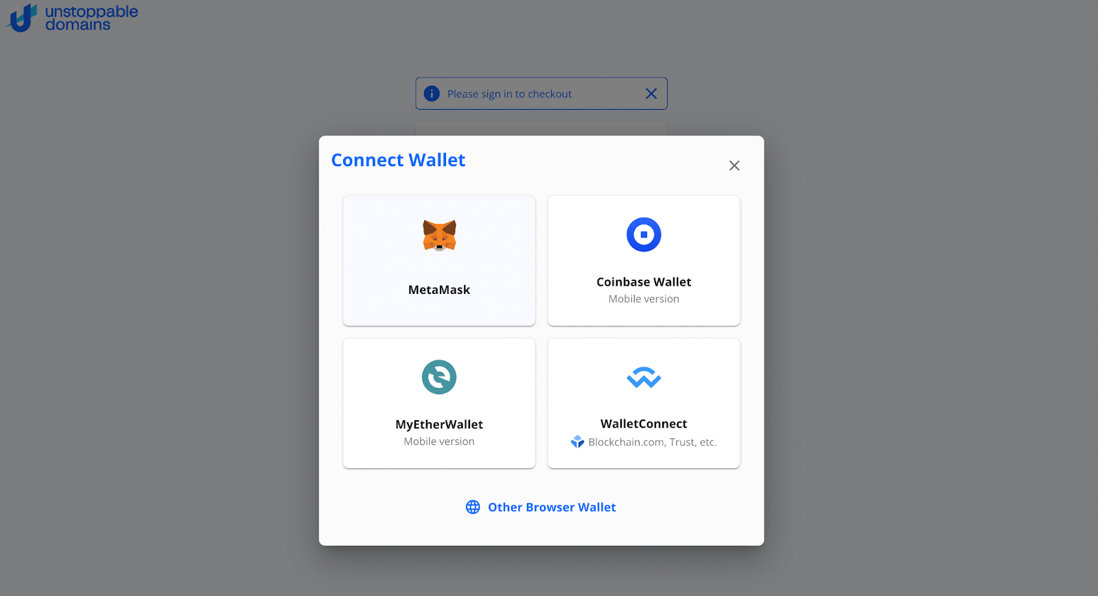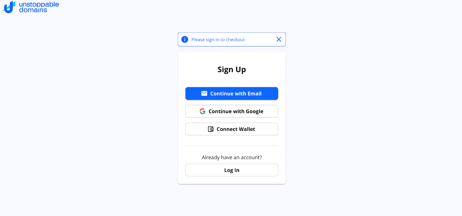 Sponsoredسجل حساب على Unstoppable Domains لإتمام عملية الشراء باستخدام البريد الإلكتروني أو بواسطة محفظة العملة المشفرة.