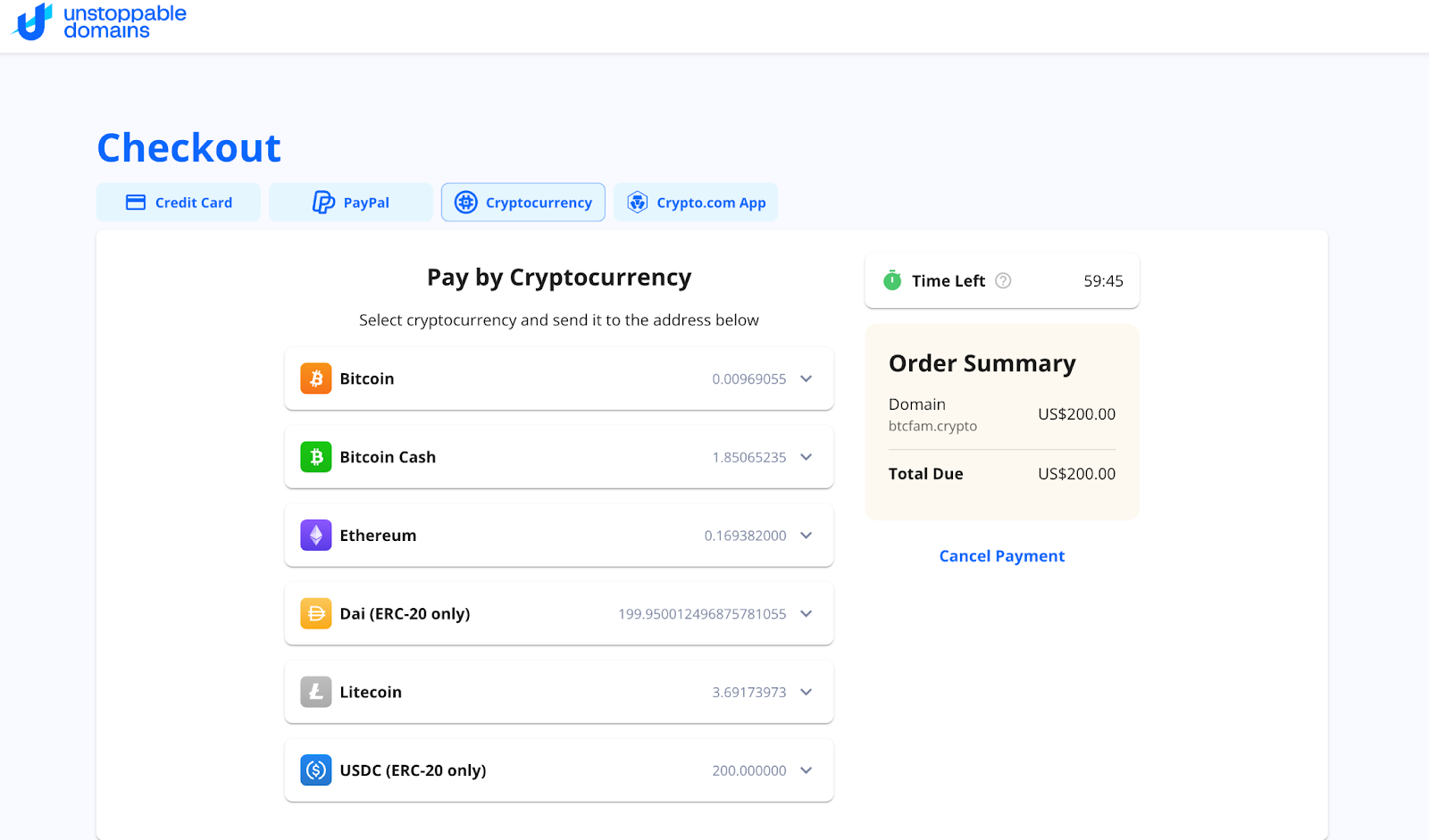 إذا اخترت الدفع بالعملة المشفرة يمكن الدفع ببتكوين أو إيثيريوم أو Dai (رمز ERC-20 فقط) إضافة إلى لايت كوين و USDC (رمز ERC-20).