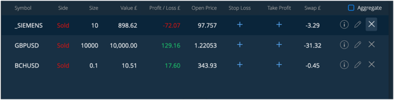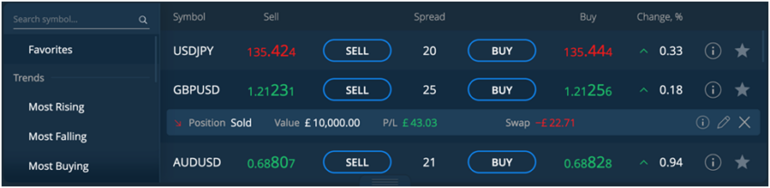 آفاتريد هي منصة تداول لعقود الفروقات (CFD). مما يعني أن المتداول لا يقوم بشراء الأصل محل العقد، بل يضع رهاناً على حركة سعر الأصل. ويمكنك رؤية الأزرار الأساسية لكل أصل، وهي "شراء" و"بيع."