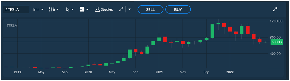 على سبيل المثال، في هذا المخطط، يمكنك رؤية أن سهم تسلا في اتجاه تصاعدي. عند ارتفاع سعر الأصل يقوم المتداولون بالضغط على "شراء" لأنهم يعتقدون أن سعر السهم سيزداد ارتفاعاً. بالضغط على زر "شراء"، يقوم المتداولون بفتح موضع "شراء" آملين في ارتفاع السعر. وعند ارتفاعه يقومون بإغلاق التداول ليربحوا فارق السعر بين سعر "الشراء" والسعر لحظة "موضع غلق السوق."