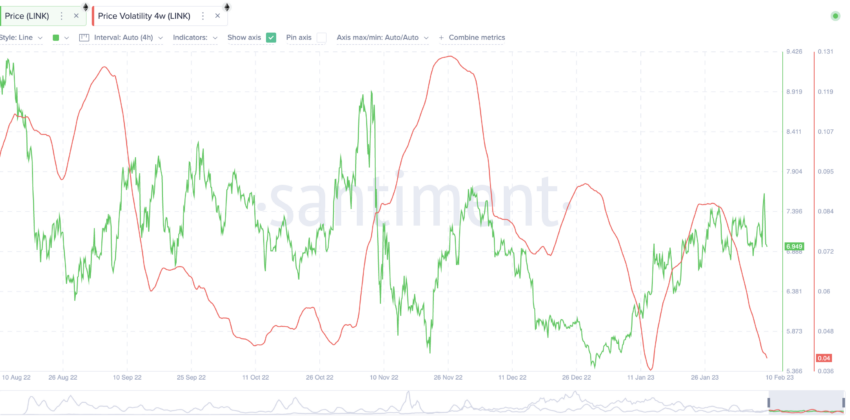 أما عن القلق الخاص بانخفاض سعر عملة LINK فقد يشير الخط البرتقالي إلى تقلب الأسعار مع ملاحظة ارتفاعها بعد كل انخفاض في التقلب منذ أغسطس 2022.