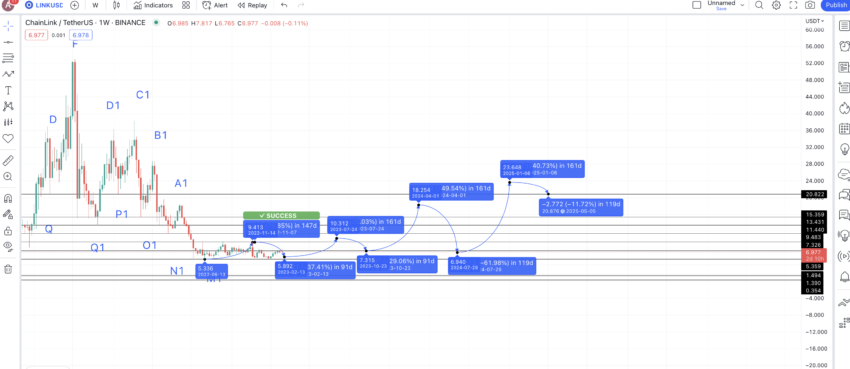 ويدل مؤشر القوة النسبية الأسبوعي إلى أن سعر LINK قد يتتبع المسار A إلى F مرة ثانية بما يؤدي إلى بداية نمط جديد.