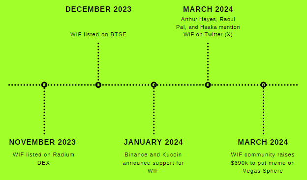 كانت هناك بعض الأحداث التي كانت بمثابة إشارات صعودية لـ WIF. حيث ظهر الرمز المميز لأول مرة في بورصة الراديوم اللامركزية (DEX) التي تتخذ من سولانا مقراً لها في أواخر نوفمبر 2023. وبعد إطلاقها، من ديسمبر 2023 إلى يناير 2024، بدأت البورصات المركزية مثل BTSE وBinance وKuCoin في إدراج WIF.
