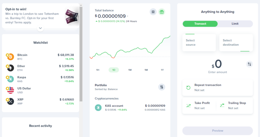 2. قم بتسجيل الدخول إلى حسابك: بعد إكمال عملية اعرف عميلك بنجاح، قم بتسجيل الدخول إلى حساب Uphold الخاص بك. كما ترى، على اليسار، توجد قائمة مشاهدة الرموز المميزة الشائعة. إلى اليمين، توجد لوحة لإنشاء المعاملات. كما في المنتصف، يوجد قسم يسرد رصيد حسابك وسجل المعاملات.