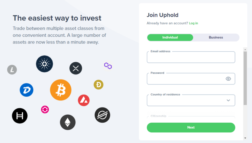 1. قم بالتسجيل للحصول على حساب: قبل أن تتمكن من شراء WIF، ستحتاج إلى العثور على بورصة والتسجيل للحصول على حساب. في هذا العرض التوضيحي، سنستخدم Uphold. كذلك ستحتاج إلى تقديم عنوان بريدك الإلكتروني، ورقم هاتفك، وهويتك الحكومية، ومسح وجهك للتسجيل.
