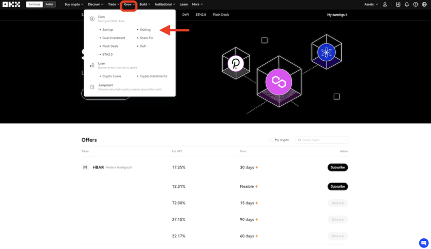 داخل بورصة OKX انتقل إلى Grow واختر Staking.