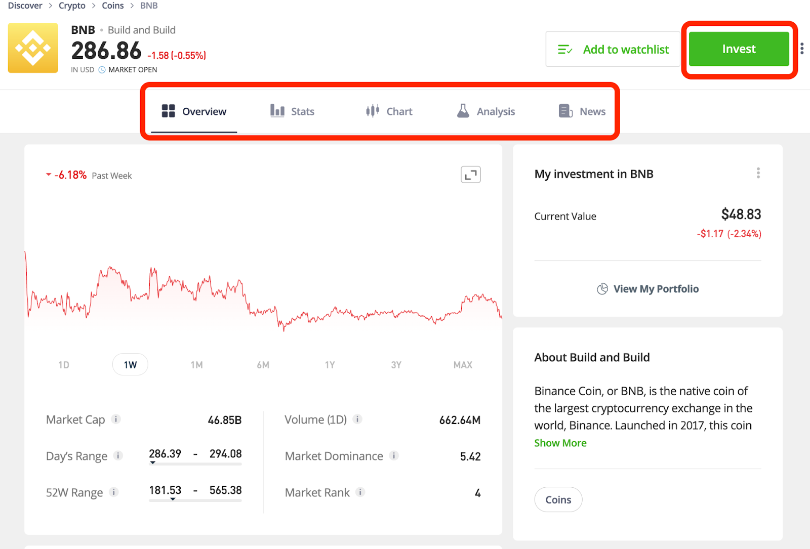 وعند النقر فوق الأصل المشفر، سوف ترى صفحة عملة BNB والتي تسرّد البيانات والمخططات والتحليلات وأخبار الأصل الرقمي، ولشراء العملة اضغط على Invest.