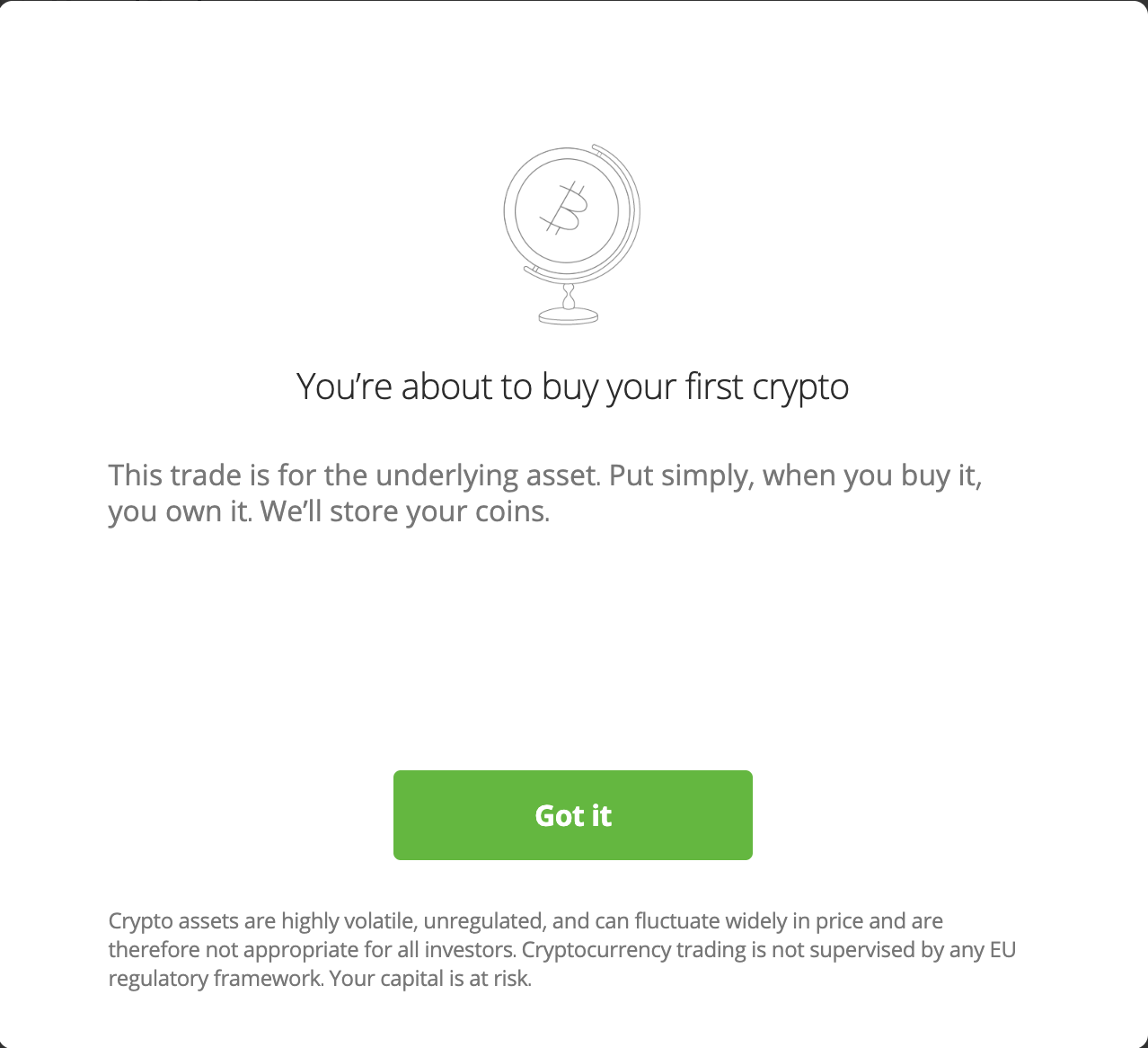 وإذا كانت المرة الأولى التي تفتح فيها صفحة العملات الرقمية سوف تحصل على رسالة من بورصة eToro.