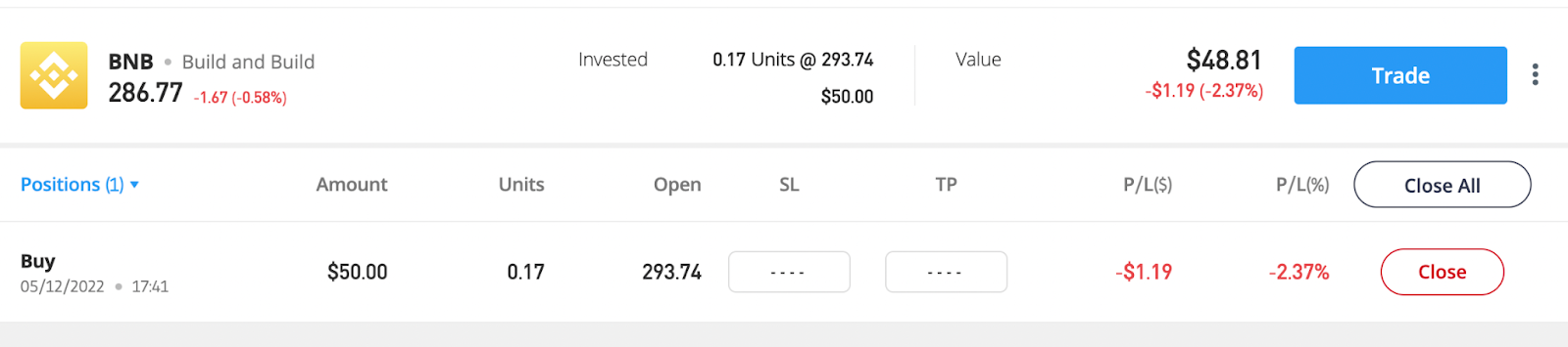 وجدير بالذكر أنه يتم تداول أصول أخرى داخل هذه البورصة على شكل عقود مقابل الفروقات أو عقد الفروقات، ولكن بالنسبة إلى التشفير والكريبتو تقدم لك eToro ملكية مباشرة للأصل الرقمي، بما يعني تملك مباشر لعملات BNB وتخزين للأصول