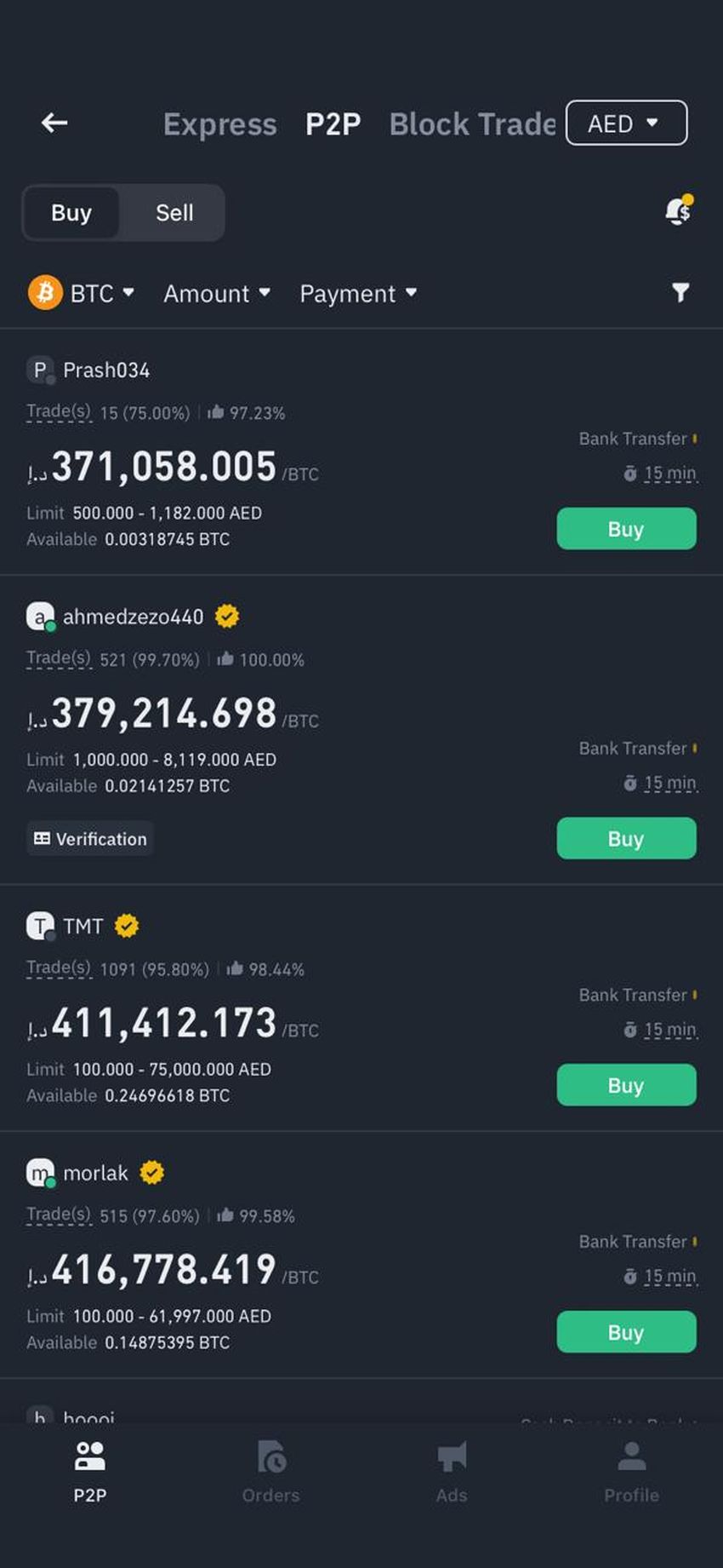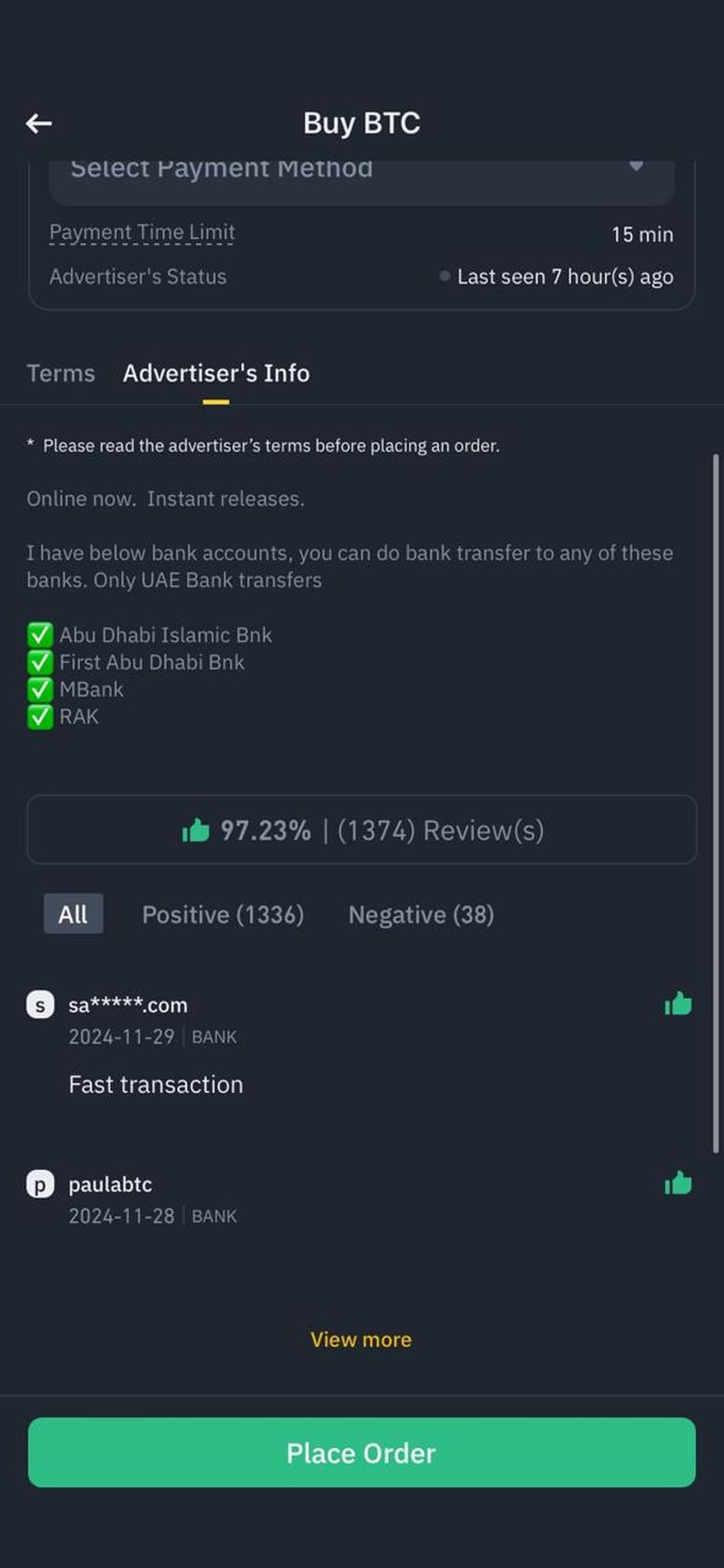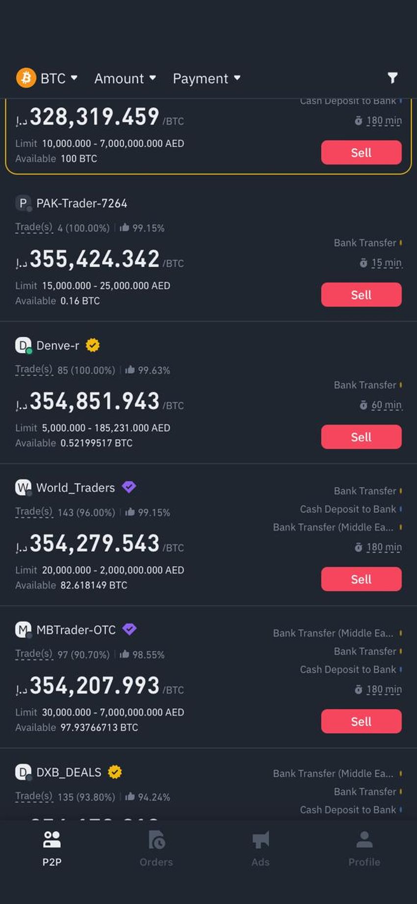 ستجد واجهة المستخدم مثل الصورة بالأعلى وبالتالي يمكنك أن تبحث في هؤلاء الباعة على البائع المناسب لك للتعامل معه. لاحظ أن معيار الإختيار سيكون على أساس الريفيوهات السابقة للمشتريين من هذا البائع وطريقة الدفع. ستجد طريقة الدفع دائما على اليمين سواء bank transfer أو محفظة إلكترونية. إضغط على البائع الذي تريد التعامل معه وستجد هذه الصفحة قد فتحت.