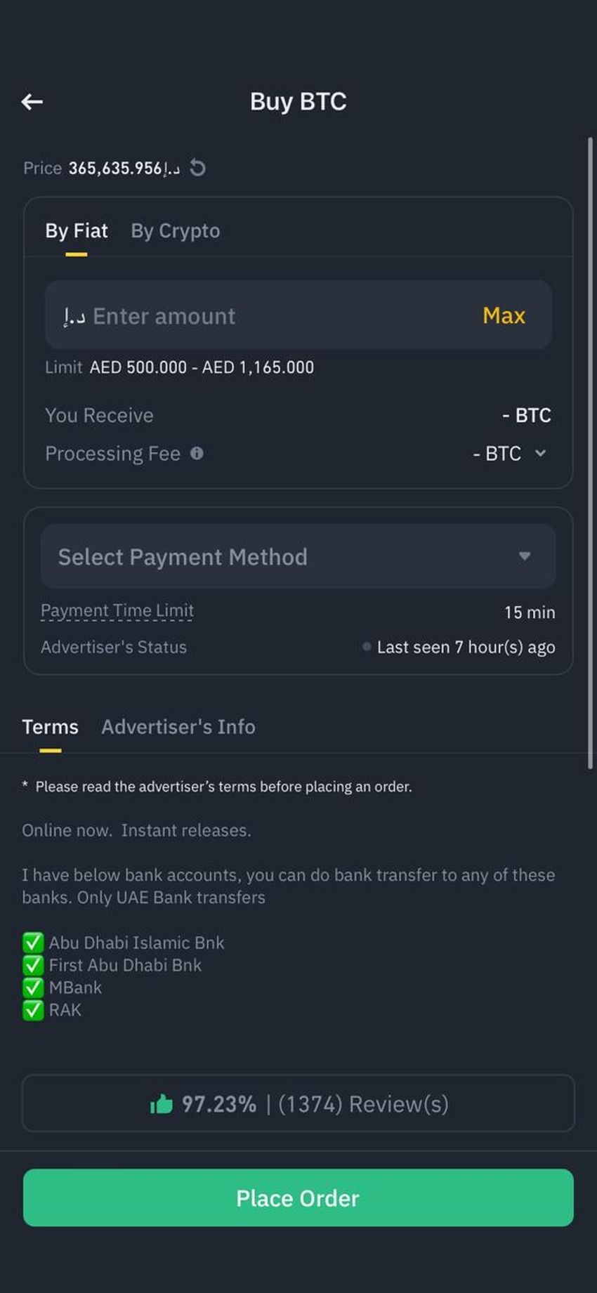 قم بوضع عدد الدراهم التي تريد الشراء بها وبعد هذا إضغط على place order. لاحظ أنك لست بحاجة عند شراء البيتكوين P2P إلى شراء عملة كاملة. يمكنك أن تشتري حتى ب100 درهم فقط أو 100 ريال. الأمر متوقف على الحد الأدنى الذي يقبله البائع. بعض البائعين مثل الذي بالصورة يجب المعاملات بحد أدنى 500 درهم البعض الآخر قد يقبل 100 درهم فقط وهناك بعض البائعة لا يقبلو بمعاملات أقل من 100 ألف درهم. وبالتالي ستجد تشكيلة مختلفة على هذه السوق من البائعين المختلفين.