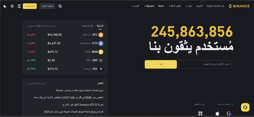أول خطوة ستكون الدخول على منصة بينانس ثم إنشاء حساب عن طريق البريد الإلكتروني. تذكر أن منصة بينانس هي منصة مركزية وبالتالي لن تتمكن من التعامل معها بمحفظة ساخنة. وهذا يعني أنك يجب أن تقوم تسجيل حساب على المنصة من أجل إستخدامها. تأكد من إستخدام لكلمة مرور قوية وأنك تضع أيضا رقم الهاتف الخاص بك لزيادة الآمان. لاحظ أن المنصة قد تكون غير متاحة أو ممنوعة في بعض البلدان العربية وفي هذه الحالة ننصح بالتأكد من الوضع القانوني لشراء بيتكوين في دولتك حتى لا تخالف القانون.