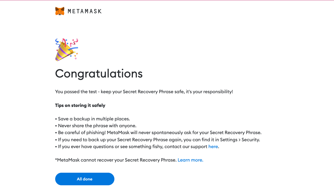 7- بعد تشكيل الجملة فانت قد أنشأت بالفعل محفظتك الرقمية على MetaMask و ستصل بذلك إلى واجهة يتم فيها تهنئتك على حسابك الجديد و تذكيرك بأهمية حفظ مفتاحك الخاص بشكل آمن.
