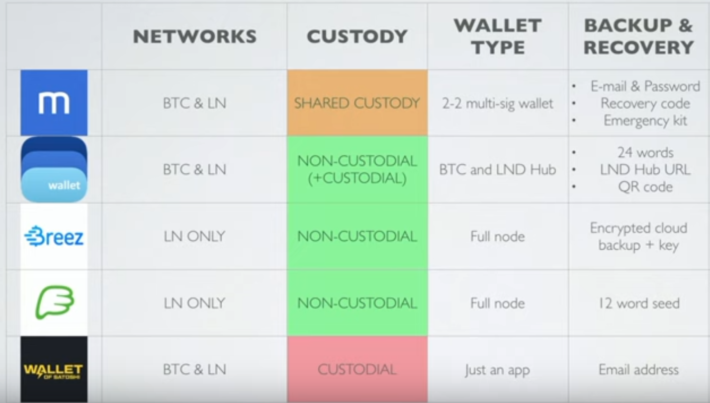 يمكنك بالصورة بالأعلى أن تجد محافظ مختلفة تدعم الشبكة. ولكن لاحظ أن محفظة Wallet of Satoshi لا تتحكم بها بنفسك. وهذا يعني أن القائمين على المحفظة هم من يحتفظون بالمفاتيح الخاصة بعملاتك. وهذا شبيه بالمنصات المركزية. وبالتالي تأكد من إختيار المحفظة التي تناسبك. ولكنها تعتبر من أكثر المحافظ المشهورة لبيتكوين وبالتالي سنتحدث عنها في هذا المقال.
