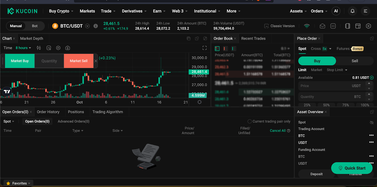 يتم التداول على منصة كوكوين عن طريق إما السوق الفورية او العقود الآجلة.