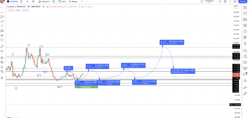 من قمة 2024 أو B2، نتوقع انخفاض القاع التالي بنسبة 52.14% (أقل رقم هبوط) لأن عملة ATOM تكسب تبني زائد للأسعار خلال الفترة الحالية، بما يضع القاع التالي عند 9.489 دولار.