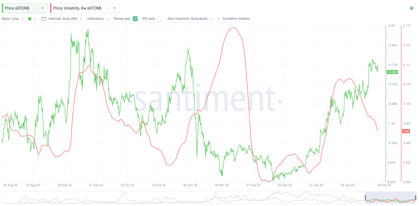 وفيما يخص المتداولين والمستثمرين فقد تتسم عملة  ATOM بالتقلب حيث يدل مخطط التقلب لمدة 4 أسابيع أن كل مرة تقلب للعملة تؤدي إلى مستوى منخفض ومن ثم تبدأ الأسعار في الارتفاع.
