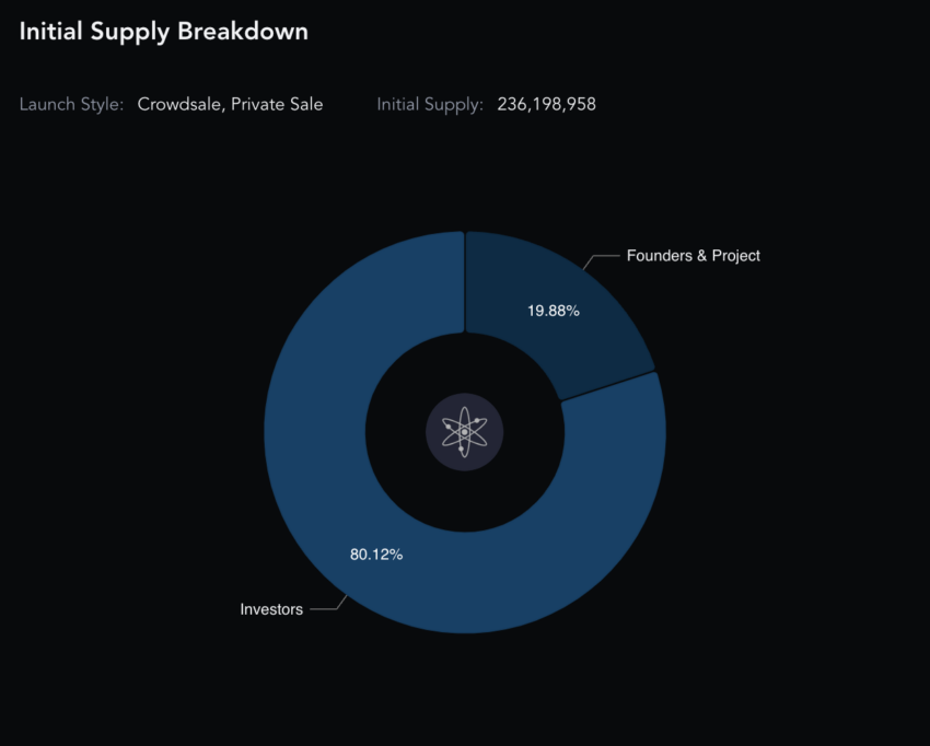 بدأ التوزيع للعملات في عام 2017 ليذهب أكثر من 80% منها إلى المستثمرين، و20% إلى المشروع والمؤسسين، كما أن العرض الإجمالي يخضع إلى التضخم الذي يتراوح بين 7% و20% بما يعني إذا تم تعليق المزيد من عملات كوزموس ستصل نسبة التضخم إلى 7% وإذا كانت نسبة التخزين أقل من العرض المتداول سيتحرك التضخم نحو 20%.