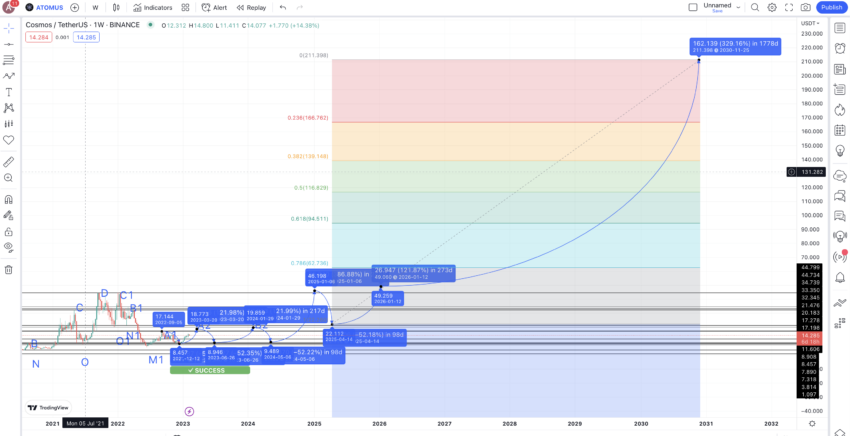ونستخدم هذه الأرقام أعلاه في رسم مسار السعر المستقبلي لعملة Atom.